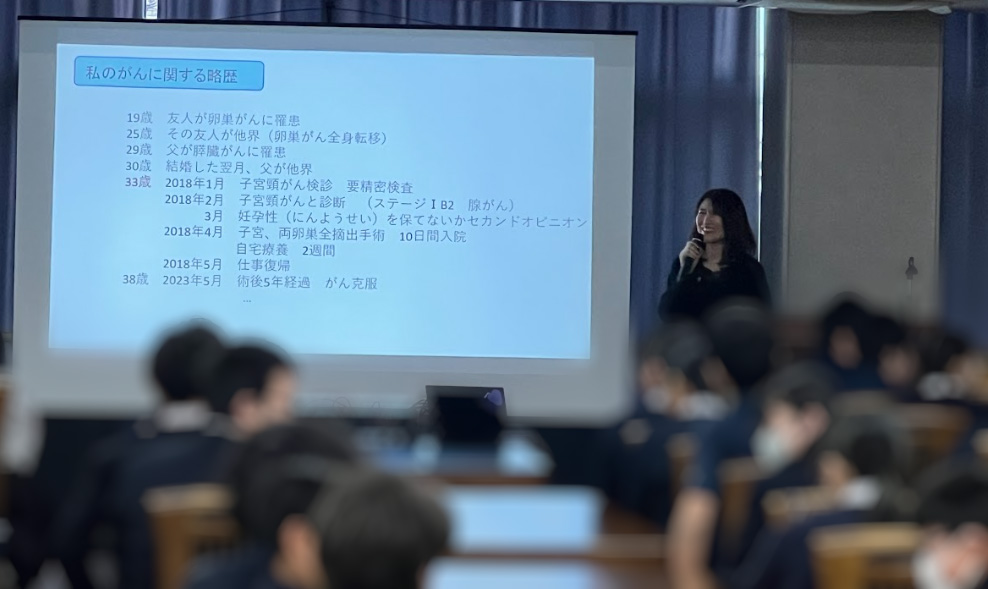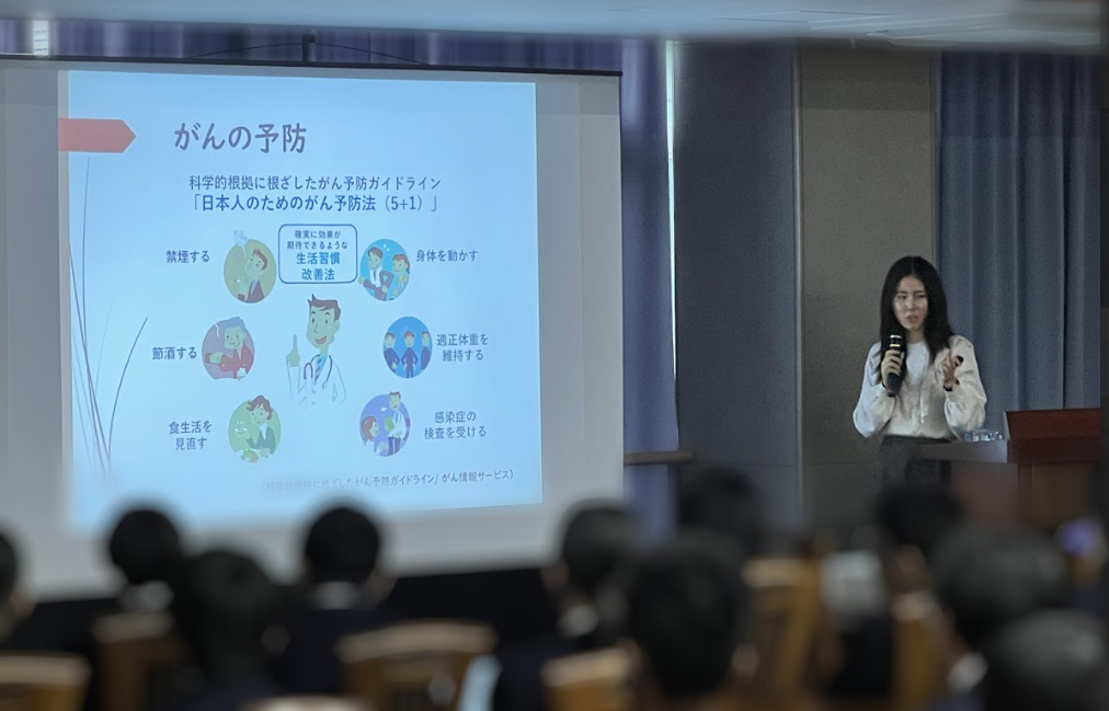 本講義のメインスピーカーである医学生は、がんの基礎知識と予防の重要性について説明しました。