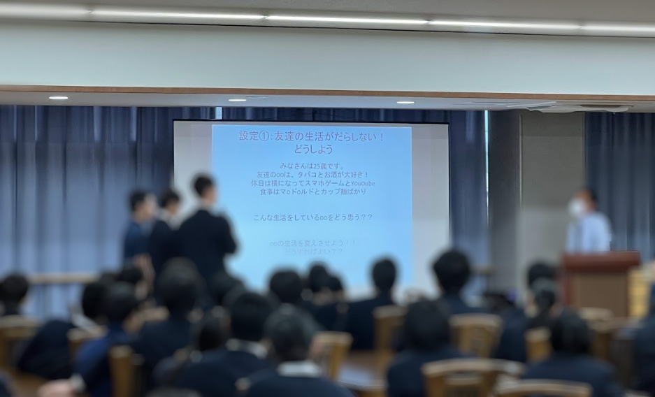 授業の締めくくりとして、自分たちが大学生という設定で「友人に対して、どのように生活習慣を見直させるか」をテーマにロールプレイを実施しました。喫煙や飲酒の改善を促すための様々なアプローチを考える機会となりました。